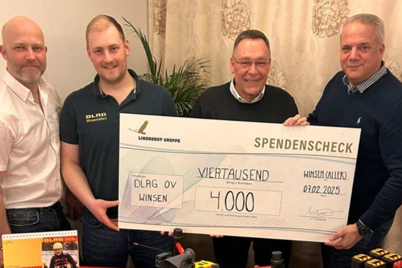 Im Rahmen des Hochwasserereignisses in der Gemeinde Winsen (Aller) zum Jahreswechsel 2023/24 zeigte sich für die DLRG Ortsgruppe, dass die Arbeit mit einer Drohne vor allem beim Aufspüren von Personen und Tieren in unzugänglichen Gebieten oder bei Nachteinsätzen eine große Hilfe wäre. Die Anschaffung eines entsprechend geeigneten und leistungsstarken Fluggerätes mit Kameratechnik nebst der Kosten für die Einweisung des Piloten in die Handhabung ist allerdings für eine gemeinnützige Organisation mit nur geringer staatlicher Unterstützung eine enorme Herausforderung. So haben sich verschiedene private Unternehmen aus Winsen (Aller) zusammengetan, um die Ehrenamtlichen mit der benötigten Technik und dem dazugehörigen Know-how auszustatten. Zusammengekommen sind die erforderlichen 18.000 Euro, von denen die Lindhorst Gruppe ihrerseits 4.000 EUR beigesteuert hat. Die Spendenübergabe erfolgte kürzlich durch den Vorsitzenden des Förderfonds der Lindhorst Gruppe, Dirk Oelmann, und den 1. Stellvertretenden Bürgermeister, Olav Mangels, an den 1. Vorsitzenden der DLRG Ortsgruppe Winsen (Aller), Matthias Többens, sowie den frisch gebackenen DLRG-Drohnenführer, Robert Leineweber.