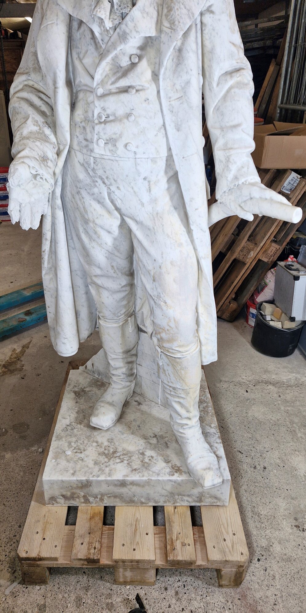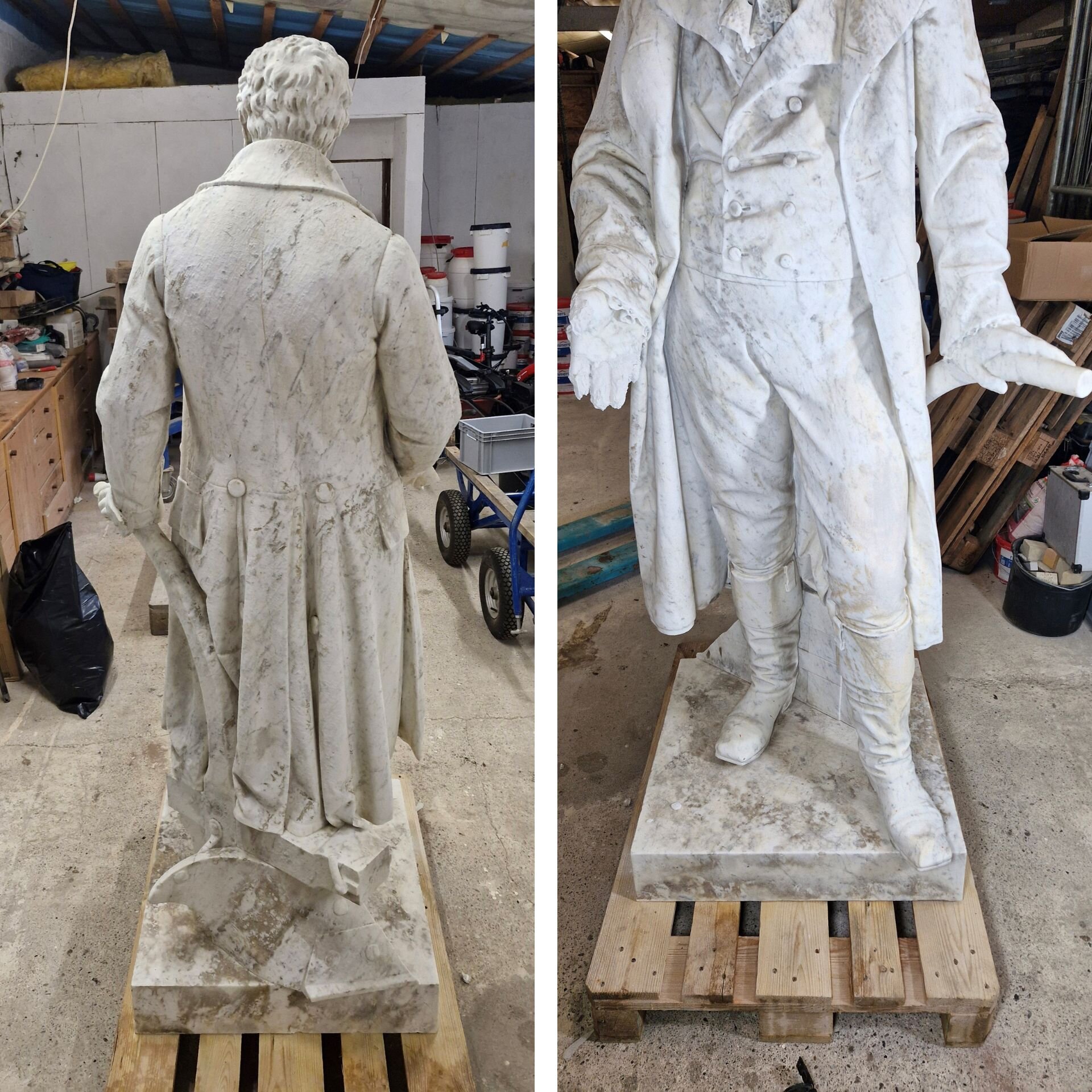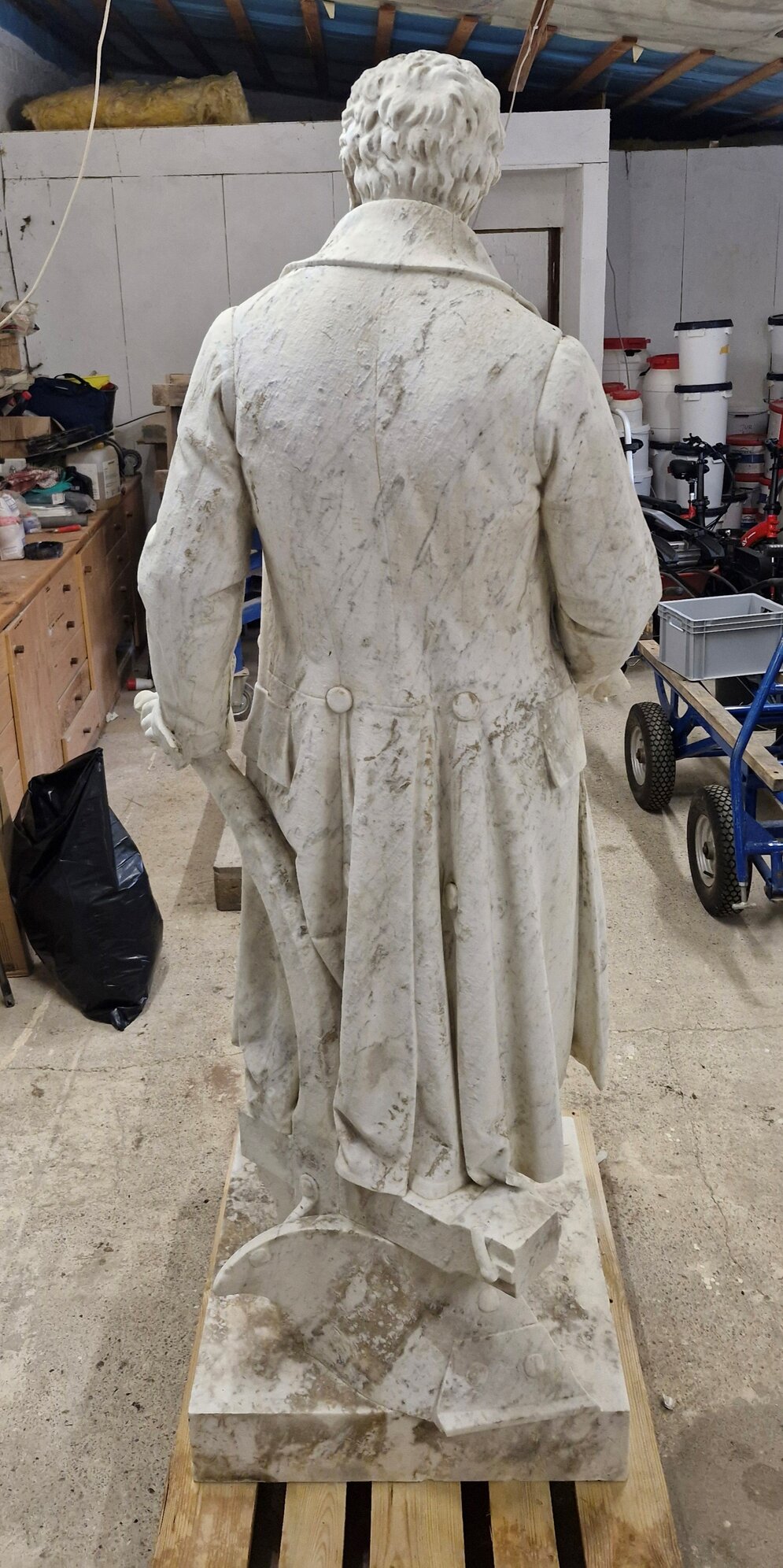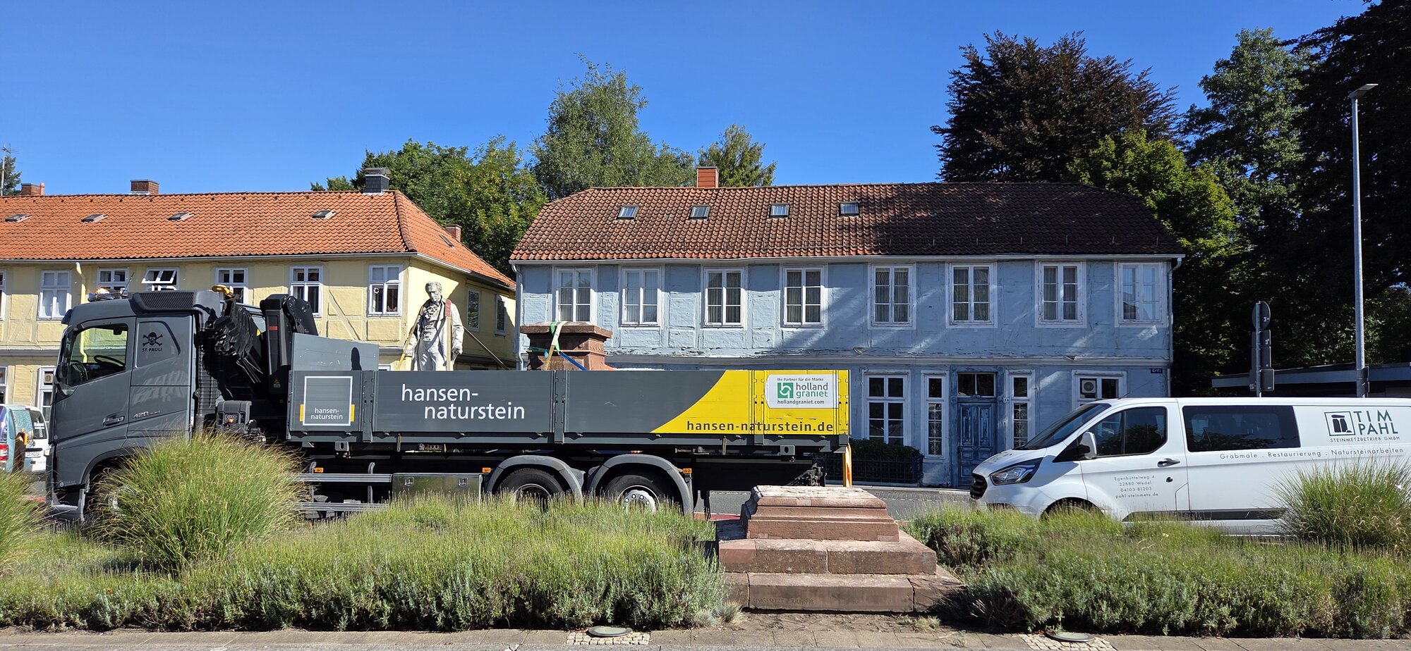 Am 18. August 2025 wurde das Denkmal fachmännisch vom mit der Restaurierung beauftragten Steinmetz- und Restaurationsbetrieb Tim Pahl demontiert und nach Wedel in die Werkstatt zur Überarbeitung abtransportiert. Seitdem wurden die obersten Materialschichten geprüft, gereinigt und ausgebessert. Derzeit werden nach der Reinigung Risse verfüllt, die Inschriften neu vergoldet und Lasuren aufgetragen. Zuletzt steht die Modellage der abgebrochenen Finger noch an.